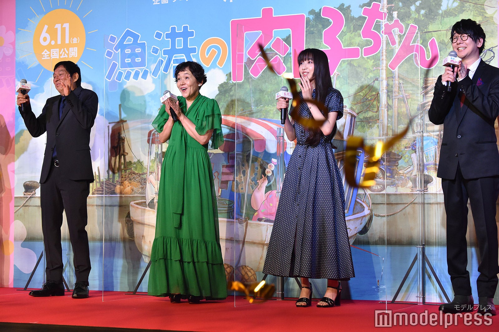 劇場アニメ映画「漁港の肉子ちゃん」(6月11日公開)の完成報告会が26日、都内で行われ、お笑いタレントの明石家さんま、女優の大竹しのぶ、モデルで音楽家のCocomi、声優の花江夏樹、子役の稲垣来泉、メガホンをとった渡辺歩監督が出席した。