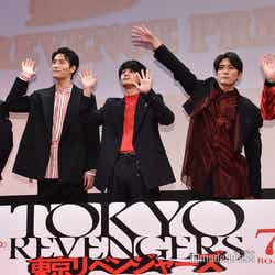 俳優の北村匠海、鈴木伸之、眞栄田郷敦、清水尋也、間宮祥太朗が30日、映画「東京リベンジャーズ」(7月9日公開)のリベンジプレミアイベントに出演。眞栄田の記録に4人が驚く場面があった。
