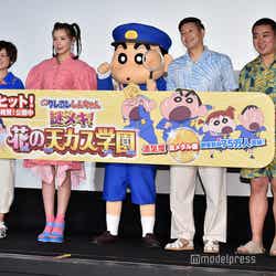 女優の仲里依紗が12日、都内で行われた「映画クレヨンしんちゃん 謎メキ!花の天カス学園」大ヒット御礼舞台挨拶に、お笑いコンビ・チョコレートプラネットの長田庄平、松尾駿、声優の小林由美子とともに登壇した。