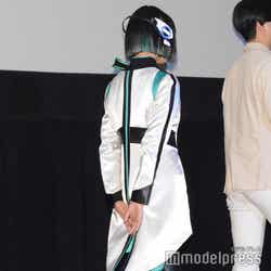 本作は、特撮ドラマ「仮面ライダーゼロワン」シリーズのその後を描いた「ゼロワン Others 仮面ライダー滅亡迅雷」の続編。仮面ライダーバルカン/不破諫と仮面ライダーバルキリー/刃唯阿の最終決戦が描かれる。井桁の申し出によって役衣装で登場した一同。井桁が「みんな、この衣装がしっくりくるので、来てくださったみなさんも喜んでくださると思ったのですが、いかがでしょうか」と客席に向かって問いかけると、観客は盛大な拍手でレスポンス。秘書・イズ役の鶴嶋は、「去年の秋にVシネの撮影が終わってからは着ていないので、うれしいというか楽しいです」と喜ぶと、「耳とかもつけているので、ちゃんとAIっぽくしないと!となります」と背筋が伸びる思いがあることも明かした。