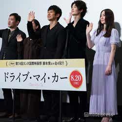 俳優の西島秀俊と岡田将生が12日、都内にて開催された映画『ドライブ・マイ・カー』(8月20日)のプレミアイベントに、共演の三浦透子、霧島れいか、濱口竜介監督とともに出演。将生がサプライズに歓喜した。