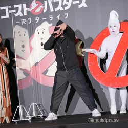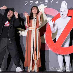 上白石は「実写の吹き替えは初めてだったので、新鮮。普段は体と表情を使ってお芝居しているので。これだけ愛されている作品に命を吹き込むことができて光栄」と言い「両親が初代映画のファンで、親子で話が盛り上がったので世代を越えて会話できる作品では」とアピールした。この日松尾は“ゴースト・バスターズのロゴのコスプレ姿”で登場。白タイツに顔面は真っ白、なぜか目の上に目を描かれており、その姿に上白石は思わず笑顔に。松尾はカメラに向かって何度も決めポーズをするも長田から「気持ち悪い」と突っ込まれていた。