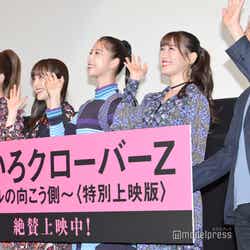 ももいろクローバーZ(百田夏菜子、玉井詩織、佐々木彩夏、高城れに)が19日、都内で行われたドキュメンタリー映画「ももいろクローバーZ〜アイドルの向こう側〜」の初日舞台挨拶にメガホンをとった酒井祐輔監督とともに参加。撮影秘話を明かした。