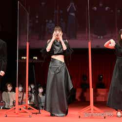 Z世代のバイブル的ホラー「カラダ探し」を実写化した本作は、抗うすべなく“赤い人”へと立ち向かう毎日をループする6人の高校生の姿を描く。この日、一同は劇中で6人を追い続ける恐怖の存在“赤い人”にちなんだレッドステージのランウェイを闊歩した。主人公・森崎明日香を演じた橋本は「なかなか、ジャパンプレミアみたいなイベントはあっても、ランウェイを歩いて真ん中に来るみたいな演出はなかったので、ちょっとドギマギしました。ちょっと恥ずかしい部分が。照れながらも歩かせていただいたんですけど、皆さんに360度から見守られながら。360度を意識しながら話していきたいなと思っております」とにっこり。