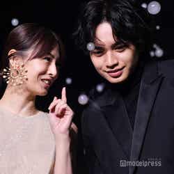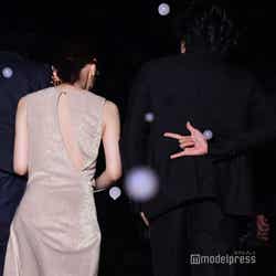 雪景色を想わせるホワイトカーペットとスモークバブルが降り注ぐ中、華やかにドレスアップして登場した二宮ら。男性陣はスーツに身を包み、北川は背中があいた綺羅びやかなゴールドのドレス姿で魅了した。