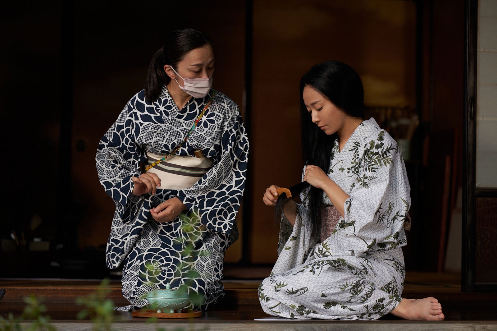 日本の伝統が息づく絶好のロケーションに、本編で魅せる妖艶でミステリアスな雰囲気とはまた違い、可憐すぎる浴衣姿で明るい笑顔を浮かべる木村や、奇しくも同じ階段で凛々しく決めたり儚げな表情で欄干に手をかけ真っすぐにカメラを見つめる長尾など、浮世離れする超現象とリアリティとが融合する唯一無二の“岸辺露伴の世界”を表現するために集まったキャスト陣が、撮影の合間に見せた貴重かつ雰囲気の良さが伺える軽やかな姿が収められている。