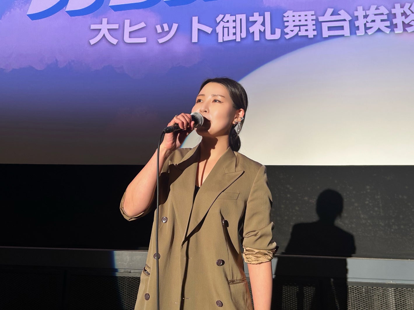 立川シネマシティの舞台挨拶では、劇伴を担当した世武裕子氏も登場。「意外な知り合いから映画に対する感想の連絡をもらったことが嬉しかった」と本作のヒットへの喜びをファンにシェアした。また、劇伴に関する質問に対しては、「(一般的に)映画には目立つシーンとは別に音楽的に大切なポイントとなるシーンがあり、『カラオケ行こ!』の場合はみなみ銀座での狂児の登場シーン。そこに流れてきたのが“ダッダッダッダッダッダ……(耳に残る劇伴のリズム)”。狂児のボケに一緒に付き合うというのが根底にあり、そこからタイトルにもどると答え合わせができる」と、作品ファンにはうれしいエピソードを披露した。