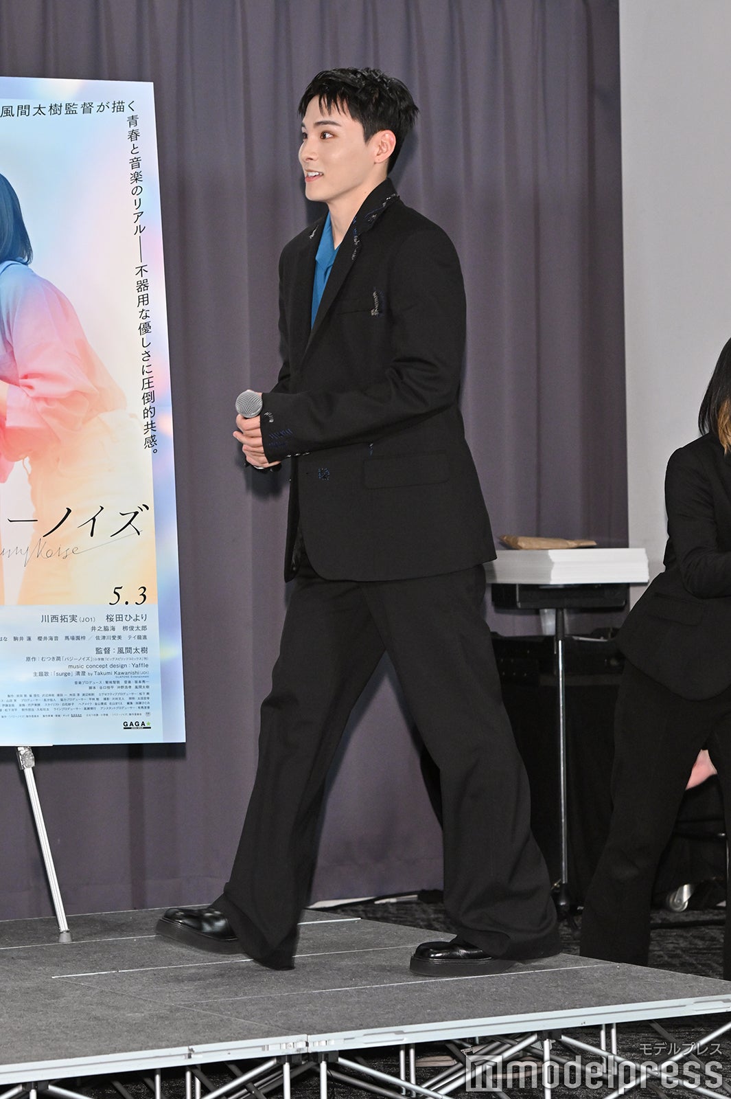 グローバルボーイズグループ・JO1の川西拓実が1日、都内の大学で行われた映画「バジーノイズ」(5月3日公開)の新入生向け特別講義に、W主演の桜田ひより、メガホンをとった風間太樹監督とともに出席。“推し”が桜田だと告白する場面があった。