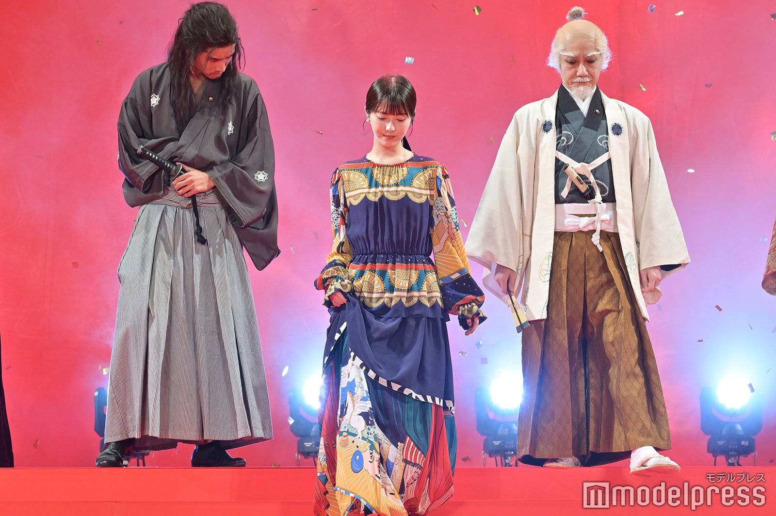 この日、浜辺と武内監督以外のキャストは役衣装での登壇。「撮影で楽しかったこと、大変だったこと」を問われた赤楚は「つけヒゲを付けておるんじゃが、ヒゲがかゆいぜよ」と龍馬としてコメント。かと思えば「えーっとですねぇ」と急に“本人”に戻り、次の瞬間は野太い声で「楽しかったのは、みんなで酒を酌み交わしたことじゃ!」と再び龍馬に。「どっちでいく?」「行ったり来たりがすごい」と他のキャスト陣を翻弄。最後は「大変だったのは土佐弁がちょっと難しかったぜよ。すごく勉強になりましたぜよ。武内監督が僕と向き合ってくれて、周りの方のおかげでこういう坂本龍馬像になったんじゃないかと思うぜよ」と本人と龍馬のハイブリッド的な話し方で笑わせた。赤楚と同じく、他キャストも「楽しかった出来事」にキャスト陣での飲み会を挙げた。小手が「飲み会は楽しかった。その後みんなで“コンビニじゃんけん”をしまして、負けた人全員分の(コンビニでの支払いを)奢ることになった。それで僕、負けまして。しょうがない、錚々たるメンツに奢れるなら光栄だと思って、みんな好きなものを買ってと言ったら、みんな翌日のことを考えてヨーグルトばっかりで。レジに行ったら3300円。リアクションとりづらかった…」と思ったほど金額が高くなく、苦笑いだった。