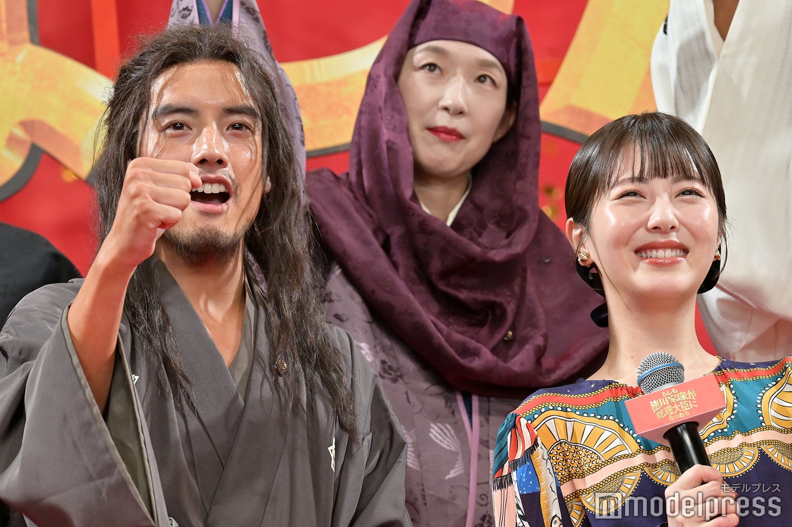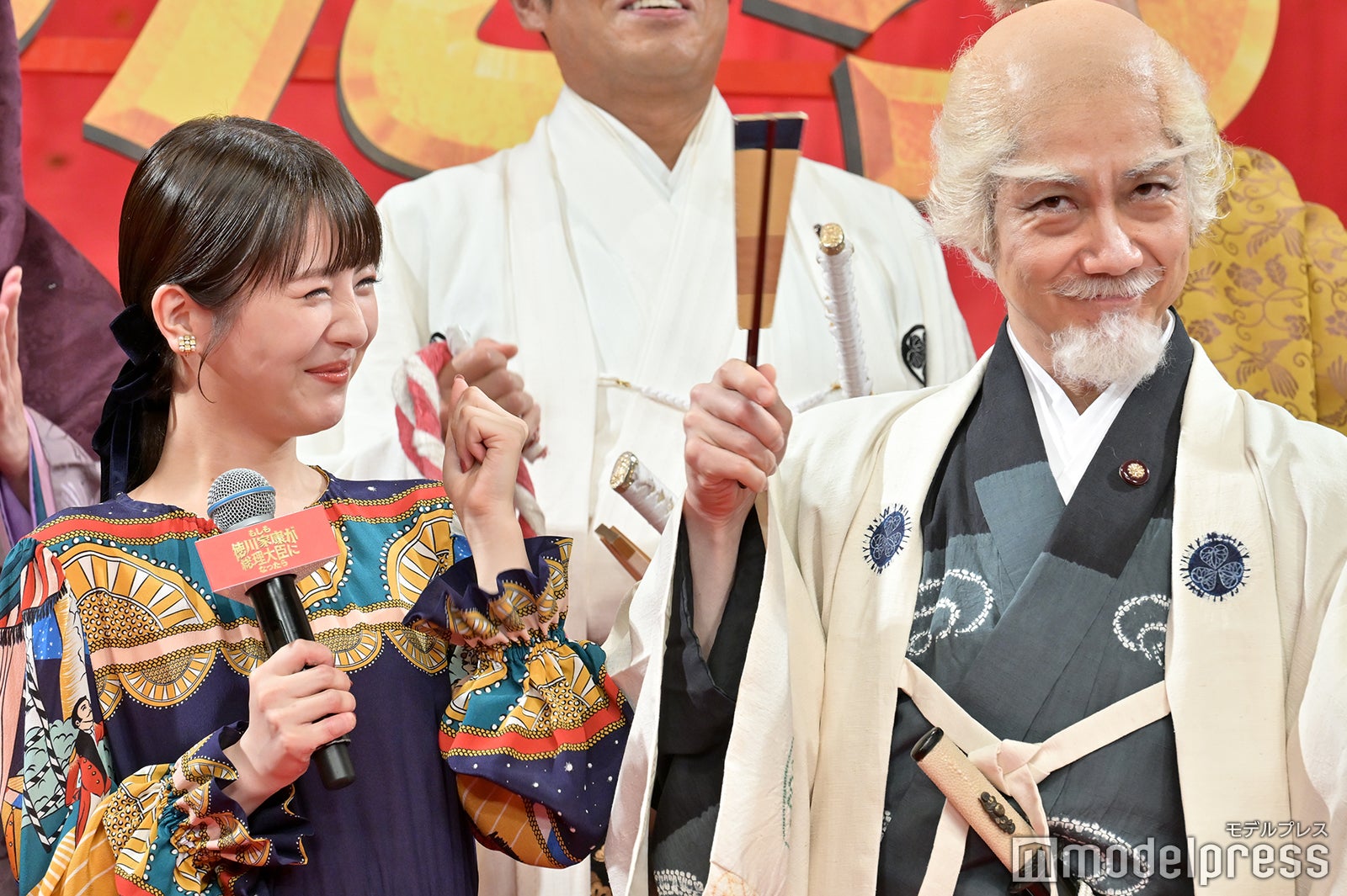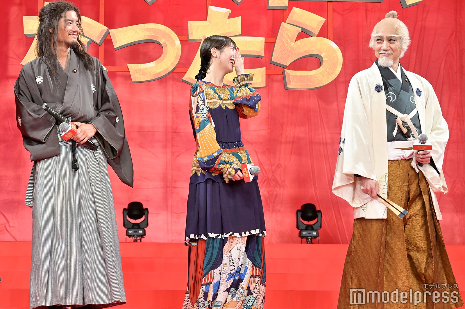 唯一、現代人役だった浜辺は、飲み会に参加できず「すごく羨ましいなぁと思ってお話を聞いていた」と悔しそうな表情。ただ、「楽しかったことは、大御所のみなさんがいる中で普通なら私が1番若手なので最初に(現場に)入るべきなのですが、みなさんのお支度時間が長いので、1番最後に入らせていただいた。いまも小手さんがすごく暑そうなのを見ると『私は心地いいんだけどな』って(笑)。ちょっと優越感がありました。すごく軽いです」と軽装でにんまりだった。