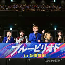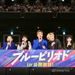 俳優の眞栄田郷敦が9日、都内で行われた映画「ブルーピリオド」の初日舞台挨拶に高橋文哉、板垣李光人、桜田ひより、萩原健太郎監督とともに出席。サプライズゲストに驚く場面があった。