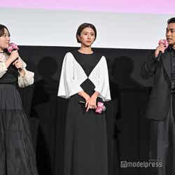 この日、ステージに登壇した柳楽は、客席から拍手を浴びると「ありがとうございます!ようやく公開初日を迎えられてとても嬉しく思っております。そして満席で来ていただき、みなさんありがとうございます!」と挨拶。黒島は「無事に初日を迎えることができて嬉しく思います。そしてみなさんの熱気に、映画を楽しんでいただけたのかなと感じています」と笑顔でコメントした。“改めて聞いて見たいこと”や“伝えたいこと”を発表する企画も行われ、真珠の無罪を信じる弁護士・宮前光一役を演じた中川から「撮影中もあえてお話をあまりしないようにしていたというか、アクリルを挟んでいない場所で話しちゃうと緊張感がなくなってしまうかなと思ってあまりお話しできていなかったんですけど、品川真珠はいろんなコスチュームが出てきますが、黒島さん的に1番のお気に入りはどれですか?」と質問された黒島は、「意外と制服が“まだ大丈夫なんだ!”って(笑)」と照れ笑い。中川から「制服めちゃめちゃ素敵でしたよね」と投げかけられ、観客から拍手が起こると、黒島は「恥ずかしいんですけど(笑)、まだもしかしたらできるのかもって思って嬉しいような、もっと大人にならなきゃいけないという複雑だけど、すごく印象に残っている衣装ですね」と回顧。MCが「ぜひ制服姿にも注目してください」とアピールすると、黒島は「最後かもしれないので(笑)」と恐縮していた。