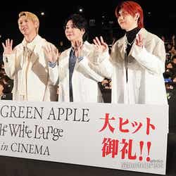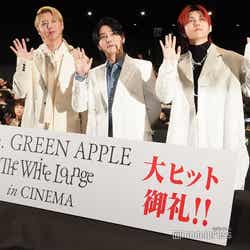 3人組バンド・Mrs.GREEN APPLE(大森元貴、若井滉斗、藤澤涼架)が9月22日、都内で行われた映画「Mrs. GREEN APPLE // The White Lounge in CINEMA」の大ヒット御礼舞台挨拶に登壇。3人が“アーティストによる音楽劇”のヒットに驚きと感謝を語った。