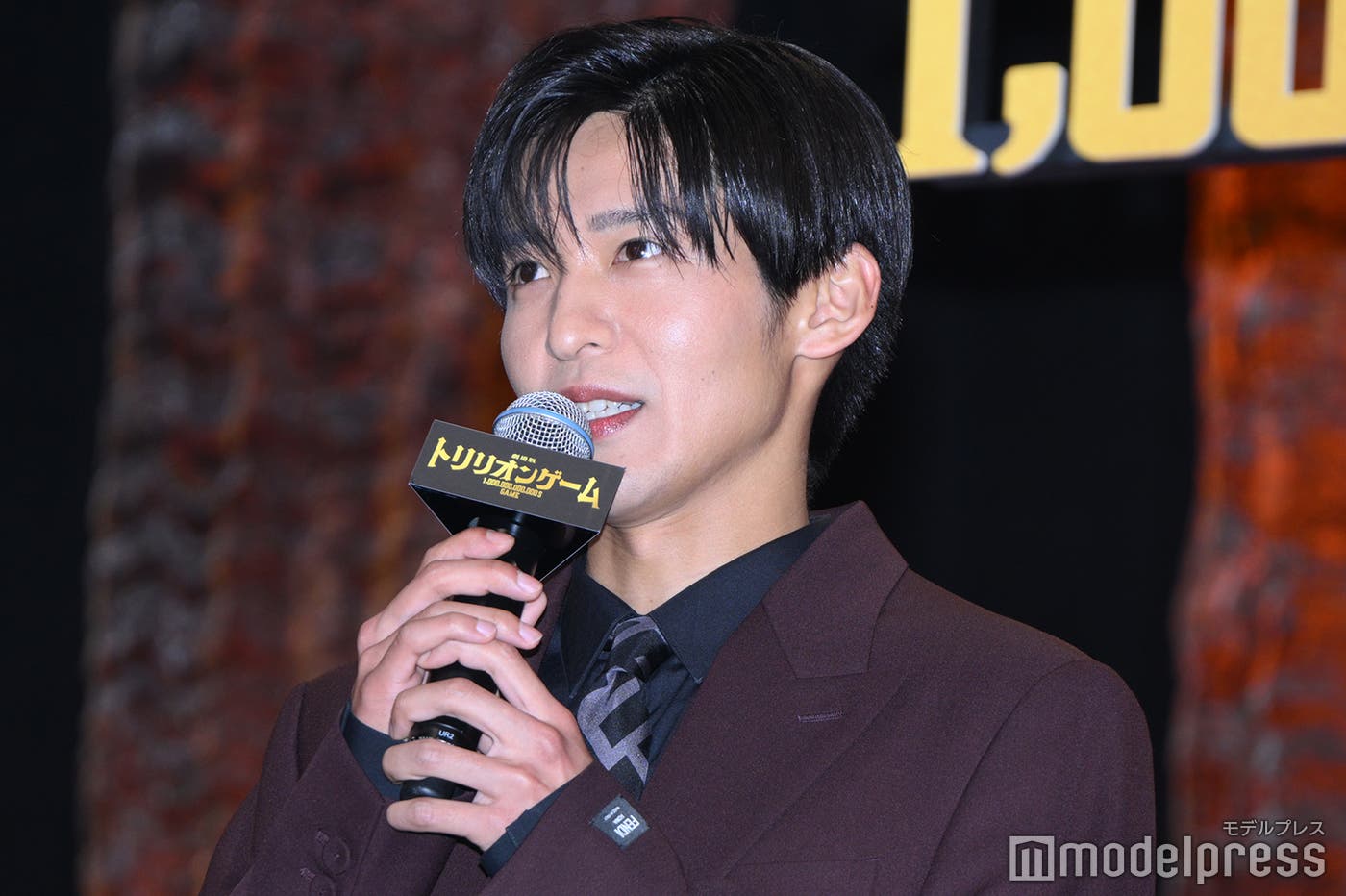 Snow Manの目黒蓮が1月14日、都内にて行われた劇場版「トリリオンゲーム」(2月14日公開)完成披露舞台挨拶に出席。緊張する俳優・原嘉孝をフォローする場面があった。