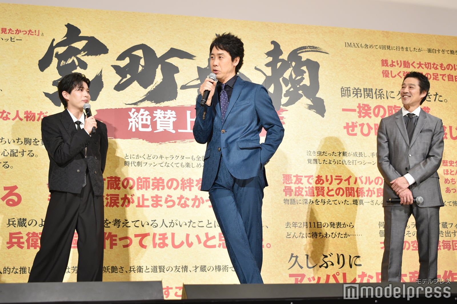 なにわ男子の長尾謙杜が30日、都内で行われた映画『室町無頼』の公開御礼舞台挨拶に、共演の大泉洋、堤真一とともに登壇。SUPER EIGHTのライブ中、2時間トイレにこもっていたという珍エピソードを明かした。