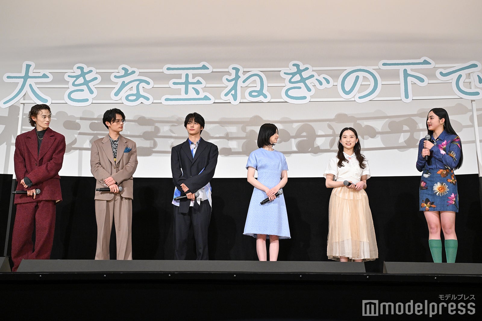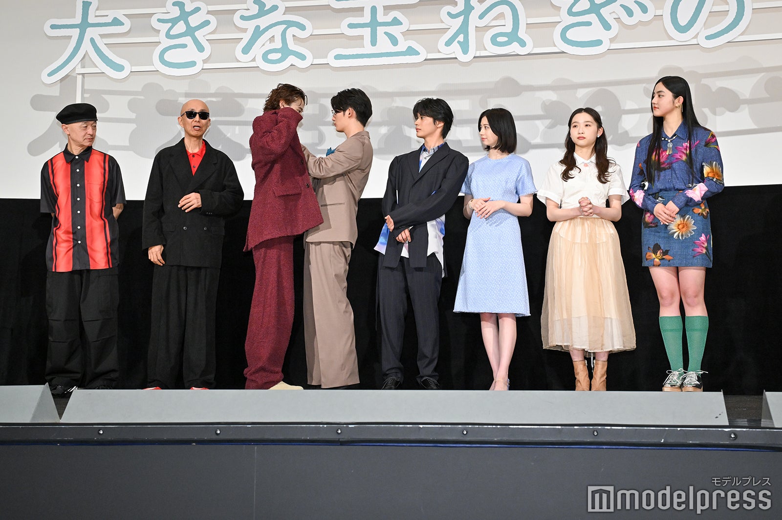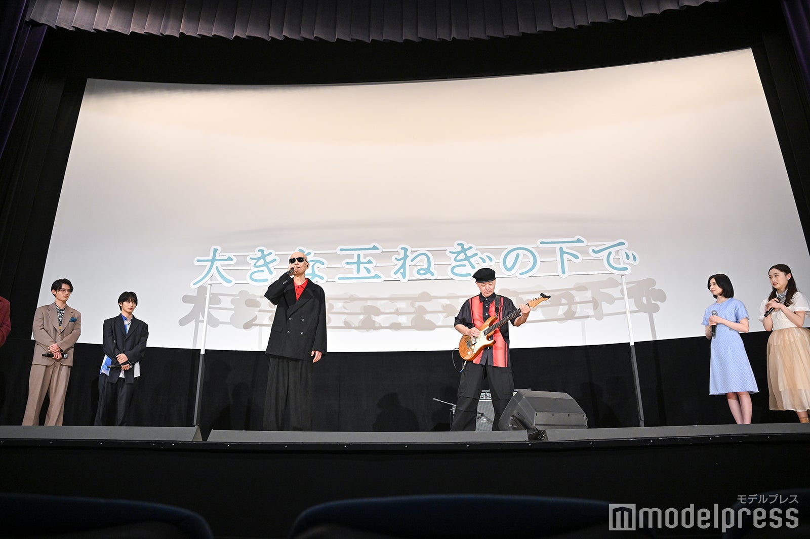 さらに、爆⾵スランプのサンプラザ中野くんとパッパラー河合がサプライズで登場するとキャストの面々は目を丸くし、2人が『⼤きな⽟ねぎの下で』を生披露することが発表されると、神尾は「えー!初日って感じだあ」と目を輝かせ、窪塚は歌を聞く前から目を潤ませ「一生忘れないですね」と感激していた。そして、爆⾵スランプの2人が『⼤きな⽟ねぎの下で』を披露し終えると、神尾は「言葉にできないです、この感情は」と胸の内を明かし、「撮影のときもずっと聞いていたので、そのときの思い出だったりも浮かんできましたし、そのときに聞いていた曲と、今の中野さんの歌い方が全然違いますし、今の中野さんだから伝わるものがすごくあってグッときました」と吐露。桜田は「こんなことがあるのかと、本当に夢みたいな気持ちでいて、お2人ともすごくかっこよかったです」とうっとりとした表情を浮かべた。