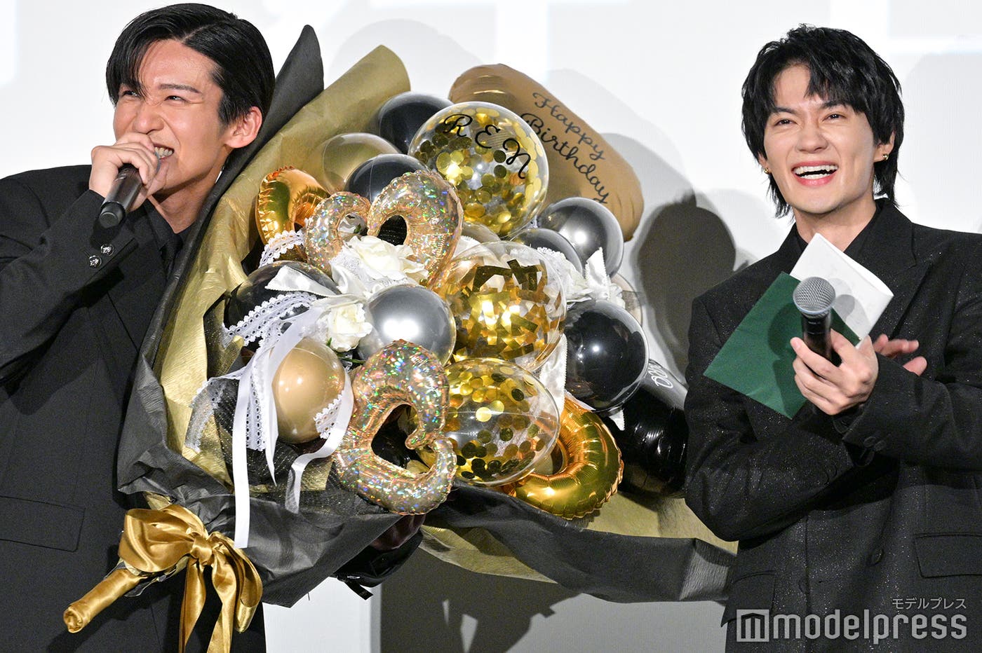 Snow Manの目黒蓮、M!LKの佐野勇斗が14日、都内で行われた劇場版「トリリオンゲーム」の初日舞台挨拶に今田美桜、福本莉子、原嘉孝、村尾嘉昭監督とともに出席。佐野が目黒にサプライズで手紙を読み上げる場面があった。
