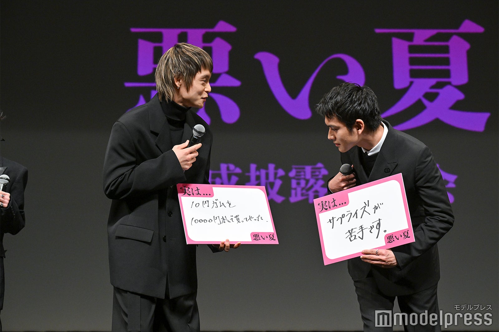 河合は「チャンス大城さんが出られているんですけど、全カット探したほうがいいと思います。すごくチャーミングです」とおすすめすると、北村は「後日談で、チャンスさんと仕事をした友だちがいて、『悪い夏』のお話をされていたらしくて、ずっとバラエティのドッキリだと思って撮影していたんですって。僕のことを本物と思っていなかったらしくて、ドッキリだと思っていたら本当に映画だったっておっしゃられていて、“ウソだろ…”って。僕はそっくりさんだと思われていました。芸人さんって大変だなと思いました」と目を丸くしながら裏話を披露し、会場の笑いを誘った。