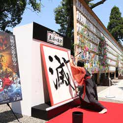 この度、本作と日本漢字能力検定協会・北野天満宮協力による「あなたが思う1番『鬼滅の刃』を表す漢字」を1つ選ぶ投票企画「鬼滅の漢字」の結果発表が、京都北野天満宮にて開催。今回の企画は、7月18日の本作の映画公開を記念して、日本漢字能力検定協会と特別にコラボを行い、対象となる漢字は「鬼滅の刃」に登場する人物や技の名前等400文字以上が対象にて、WEB投票が2週間実施された。30日のイベントには書家・川尾氏を北野天満宮に招き、「今年の漢字」同様に、大きな揮毫台に設置された用紙に1位の漢字を揮毫。瞑想後川尾氏が勢いよく筆とともに表現したのは、「滅」。「滅」は「ほろびる」「きえる」等の意味があり、作品内では登場する“鬼殺隊”の制服の背中に記載がされている最も馴染みのある漢字の1つで、今回は投票総数2万3318件のうち、5,886票の投票数を獲得した。