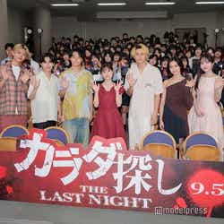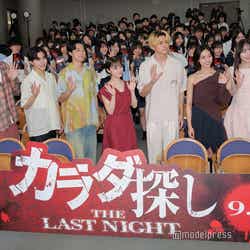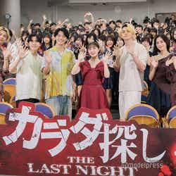 2022年に公開された実写映画『カラダ探し』の最新作となる本作は、前作を圧倒的な恐怖とスケールと凌駕する、刺激的ループ型ホラー。恋心を抱いていた明日香(橋本)を守れなかった高広(眞栄田)は、彼女を救い出すため、陸人(櫻井)たち新たなカラダ探しの参加者とともに、真夜中の遊園地を支配する“赤い人”の恐怖と対峙する。イベント冒頭には原氏が1人で登壇。映画に関するトークを行った原氏は、最後に“プレゼント”がある、ということで会場から去った。すると、入れ替わりに橋本らキャスト陣がサプライズ登場。会場は歓声に包まれた。