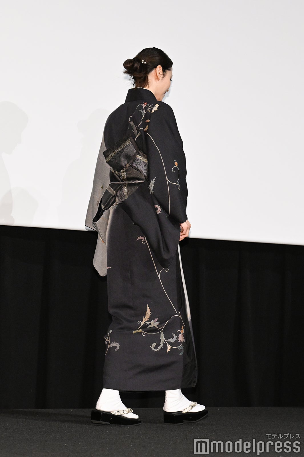 主人公の葛飾応為を演じる長澤は、シックな着物姿でステージに登壇すると「本日は私も応為を感じたい、応為を演じていたあのときをよい思い出として焼きついているので、そんな気持ちを込めて応為っぽく着物を着てきました」と打ち明け、MCから「髪型も応為っぽい」と声をかけられると、「そうなんですよ、よくお気づきで」とにっこり。改めて、同ステージに立った心境を尋ねられた長澤は「一昨年のちょうど今くらいの秋の時期に撮影をしたんですけど、あっという間に時は流れてしまって、こうやってみなさんの元に届いてしまうんだなと思うと、愛着があったので寂しいなという思いがあって、そういう気持ちにさせてくれる作品になったことも嬉しかったですし、親子の日常を淡々と覗き見しているような映画になっているので、この世界観にみなさんが没入していただけたらいいなと思っていますね」としみじみと語った。また、応為の生き様から感じたことや、共感したことを聞かれた長澤は「江戸という時代を自由に生きていた応為の姿が、この時代でもこんなに自分の思う通りに生きることができるんだなと思ったら、それは今の女性像にも通じるものがあるんじゃないかなと思って、現代的な女性だなという印象があったんですけど、応為を演じることで私自身も自分のやりたいことに向かっていく心意気を学んだ気がして、応為から得られるものが多かったですね」と吐露し、「(応為は)自分がやりたいことを明確に持っていて、(江戸時代に)その感覚があるというだけでもすごいことだと思うので、その時代のしきたりとか風習というのはピンとくることがないかもわからないけど、そこで生きている人たちの姿を見ることで通じるものがあるのではないかと感じてもらいたい。日々の記録のような映画なので、そう楽しんでもらえたらいいなと思います」とアピールした。