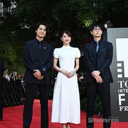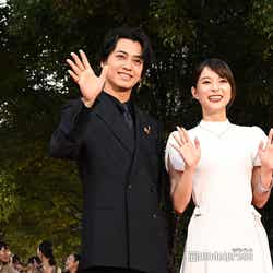 ハイネックのホワイトドレスを上品に着こなして登場した芳根。ネイビーのスーツとゴールドのアクセサリーを組み合わせた高橋とともに手を振りながらレッドカーペットを歩いた。芳根京子主演「君の顔では泣けない」