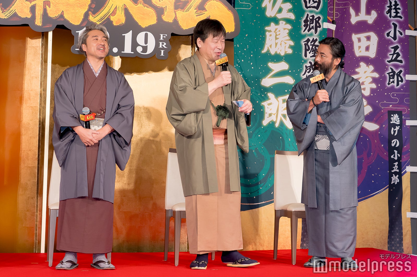 この日、顔半分を覆うほどのヒゲを生やした姿で登場した山田。記者から「髭は今日のために生やしてきたんですか?」と聞かれると「もちろん役作りのために。普段めんどくさいなって思いながら我慢しております。今日のためのわけがありません」とキッパリ。佐藤が「今日のためって言ってもいいじゃん!」と反応すると、山田は「今日は僕の人生の中でそんなに大事な日じゃない」と口にし、会場の笑いを誘った。佐藤は「やめろよ!いい加減にしろよ!」とツッコんでいた。桂小五郎を演じた山田は、W主演を務めたムロと佐藤について「すごい真面目な先輩2人です」と告白。ムロは「今回は、ページ数でいうと38ページ、分数にすると35分くらい、ずっと3人(ムロ、佐藤、山田)で基本座って会話をするシーンがあります」とあるシーンを挙げ、山田は「あれはすごい緊張感でした」と振り返った。
