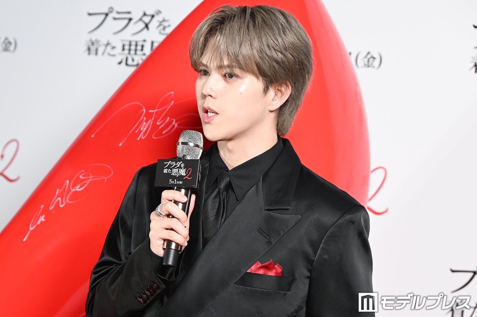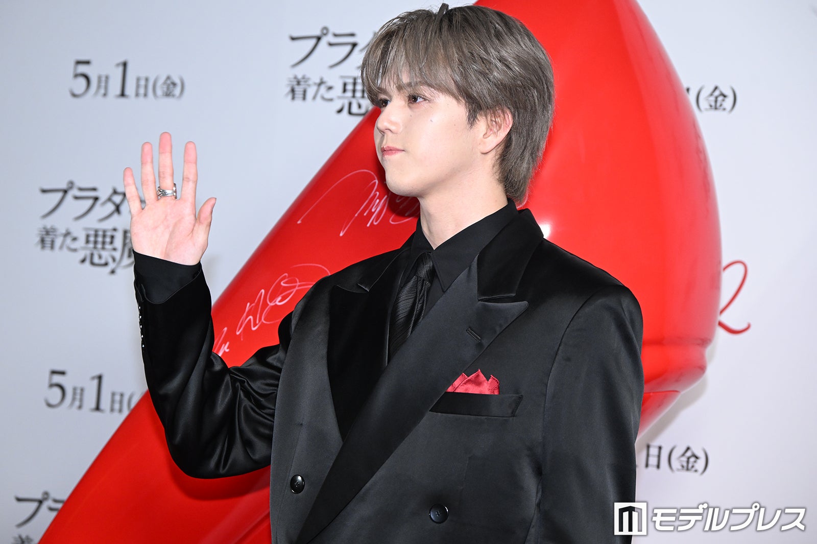 8人組ダンス&ボーカルグループ・MAZZEL(マーゼル)のRAN(ラン)が4月23日、都内で行われた映画「プラダを着た悪魔2」(5月1日公開)ジャパンプレミアイベントに登壇。赤がワンポイントのブラック衣装で登場した。