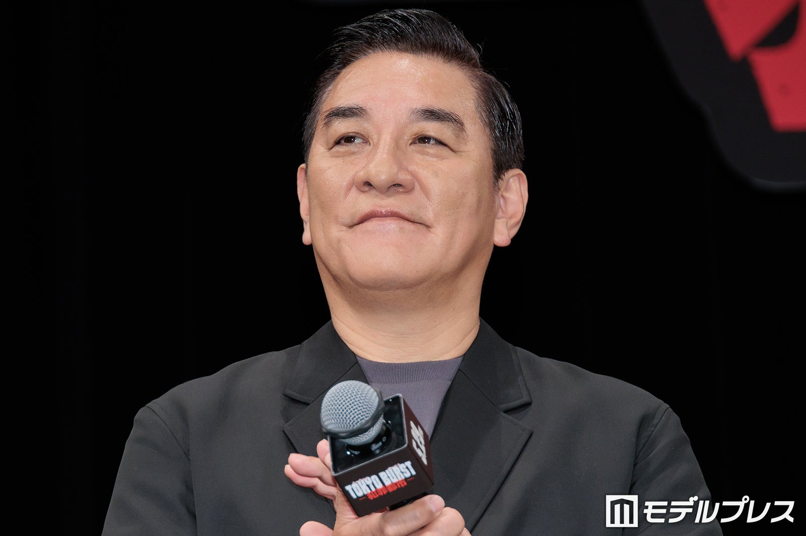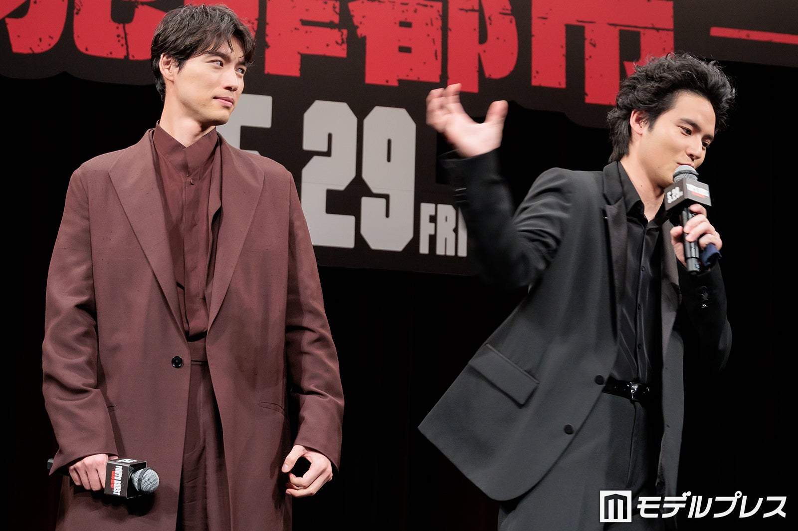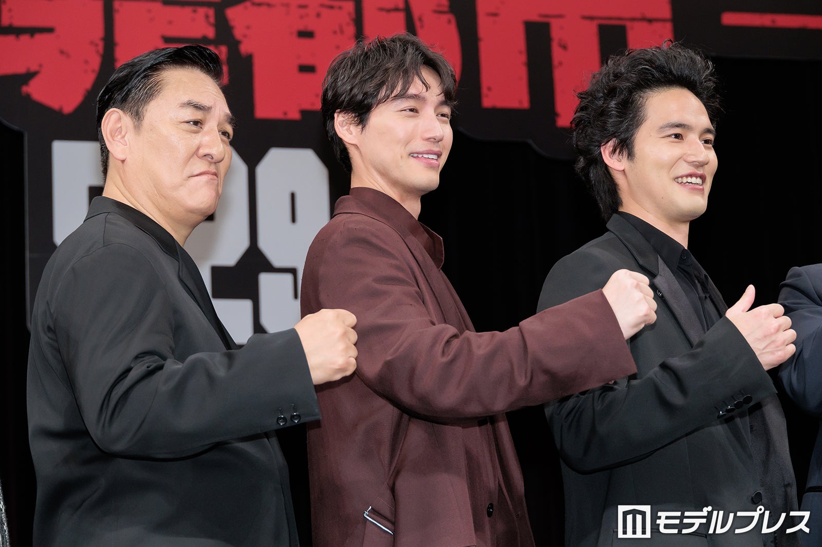 “最狂ヴィラン”村田蓮司を演じた福士は「撮影が始まる前に15キロぐらい筋肉と脂肪で両方を増やして、今は脂肪だけ10キロ落としてるっていう感じですかね」と役作りを経ての現在の肉体を報告。「そんなことできるんですか」と司会が驚くと、「騙し騙しやってました(笑)」と笑いつつ、「韓国の『犯罪都市』の方ではマ・ドンソクさんだったり、本当に体がでかい大きい人たちがたくさんいるので、僕もマ・ドンソクさんに負けないぐらいでかくしようと意気込んで今回の作品に入りました」と語った。そんな福士について、水上は「僕もそれなりに体を大きくする方ではあったと思うんですけど、今回の福士さんの仕上がりを見て、『もう僕は筋肉って言えないな』と思いました」と吐露。「三角筋の筋肉がでかすぎて、ここを掴んでどこかに投げるみたいなアクションがあるんですけど、できないんですよ。オイルでテカらせてますし、ヌルヌルするんです(笑)」と福士の大きい上にヌルヌルする筋肉によって苦労した撮影エピソードを披露し、「負けました」と敗北を宣言していた。すると突然、福士は「やー!」となかやまきんに君のようなポージングで力強く発声。会場には拍手が巻き起こり、水上が「その方いらっしゃらないですから」とツッコミを入れて盛り上げた。(modelpress編集部)
