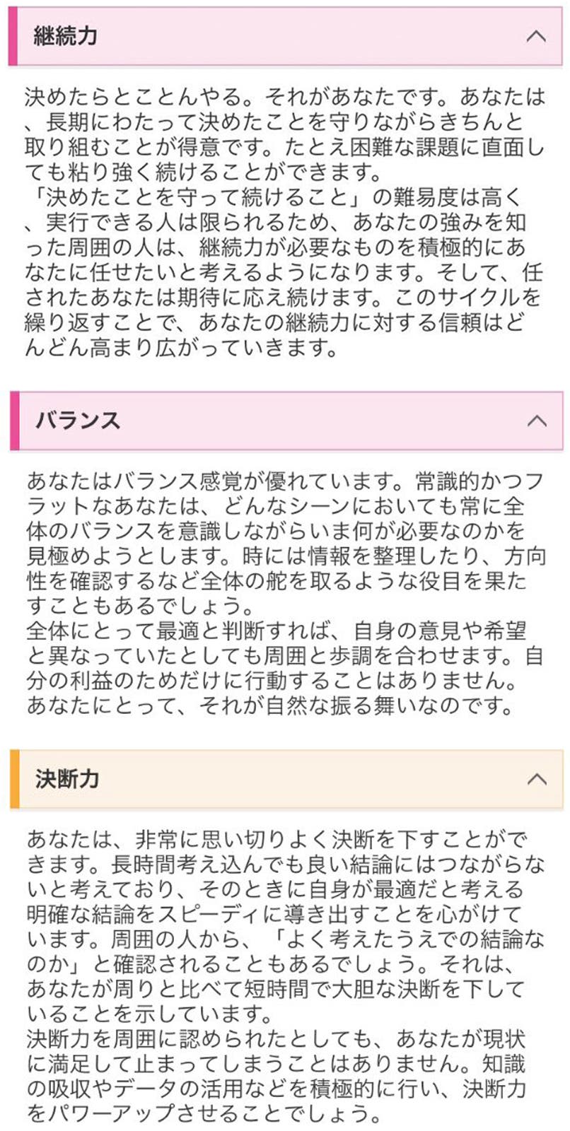 私が診断した結果の中で特に驚いたのは「継続力」の項目。決められたことしか出来ず、柔軟性がないのは短所だと思っていたんです。でも診断結果には「たとえ困難な課題に直面しても粘り強く続けることができます」と書いてあり、「なるほど!短所も捉え方によっては長所なのか」と気付かされました。