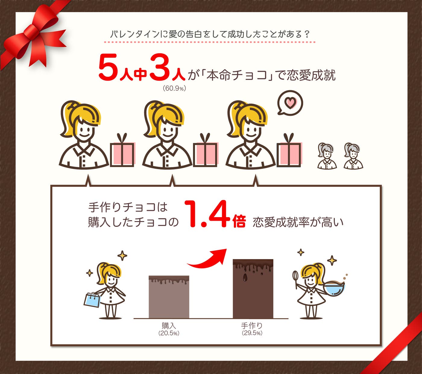 ロッテによるバレンタインに関する意識調査(※)によると、5人中3人が本命チョコで告白に成功したことがあるそう。手作りしたチョコは購入したチョコより成功率が1.4倍高いという、気になる結果も判明!