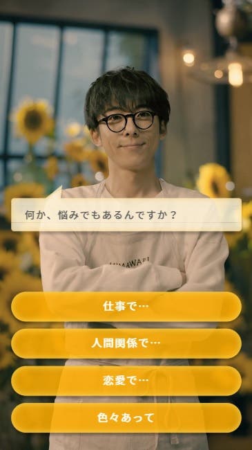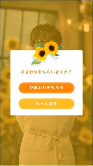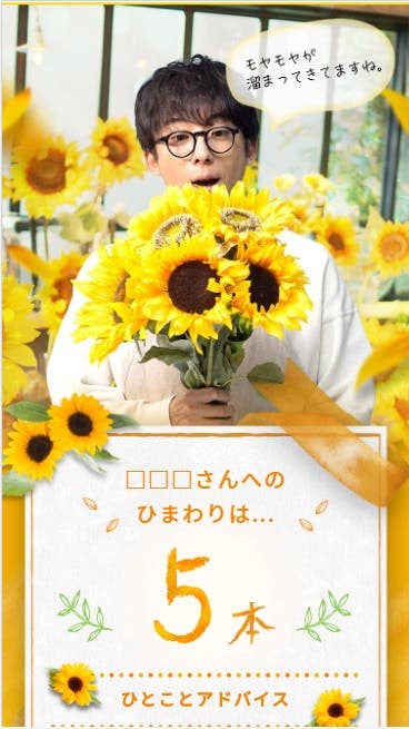悩み相談を終えると、自分の名前と共にお悩みレベルに合わせたひまわりの花束と一言アドバイスのメッセージのプレゼントが。ひまわりは1本から100本まで、一言メッセージも合わせると高橋さんから自分にぴったりの400パターンのアドバイスをもらうことが出来ますよ。太陽のように輝くひまわりの花は、もらうだけで気持ちがパッと明るくなりそう。