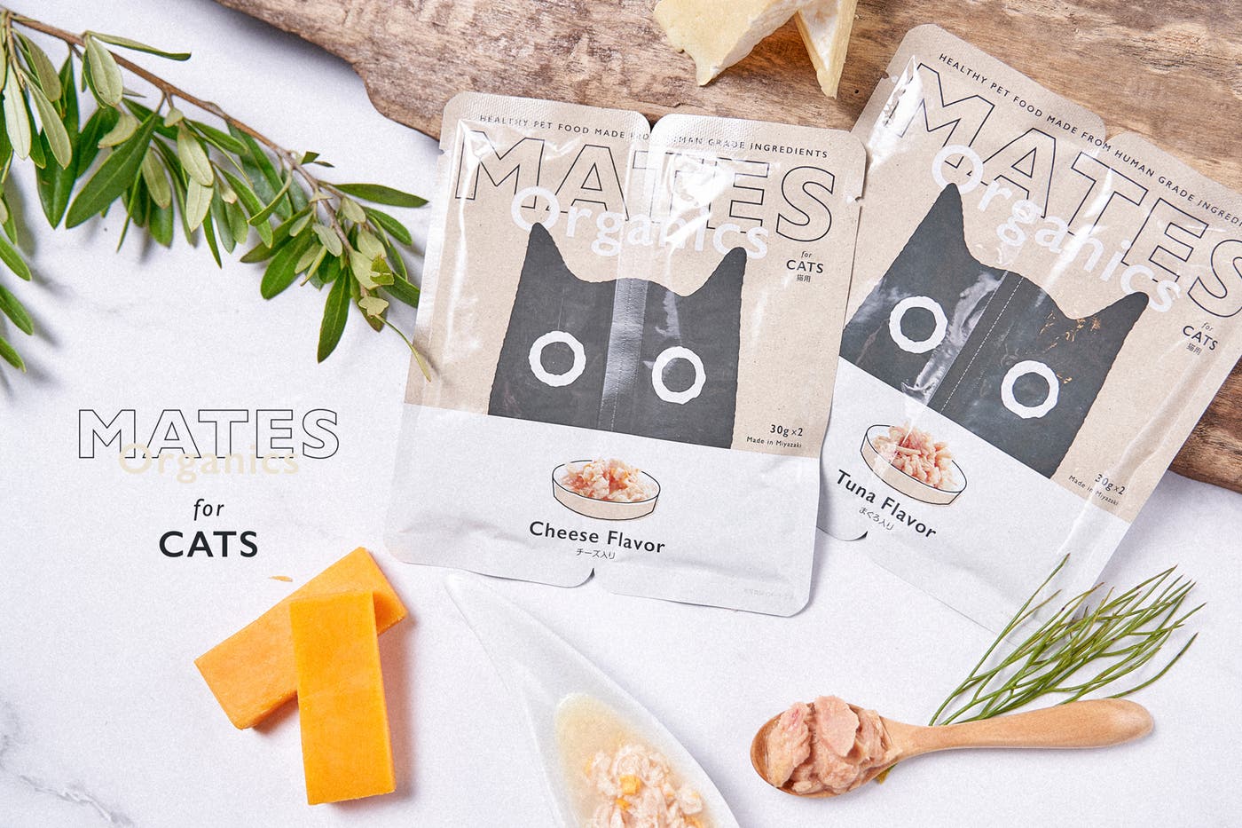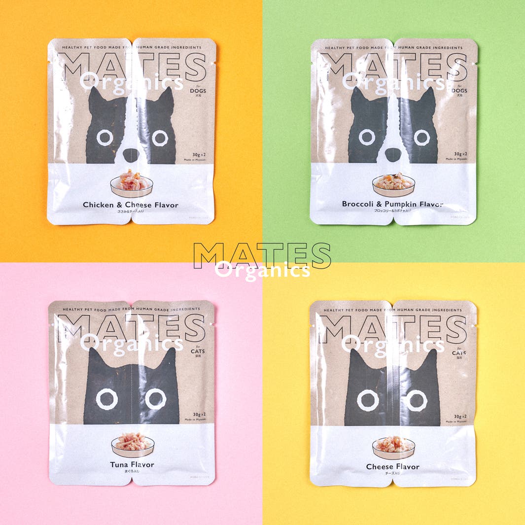 メイツオーガニックは獣医師が監修し、美味しさや原材料、オーガニックにこだわったスペシャルフード。猫用と犬用があり、「グルテン・グレインフリー」「ヒューマングレードの宮崎県産若鶏を使用」「高タンパク質」「香料、発色剤、酸化防止剤不使用」「低脂質」と5つのこだわりが詰まっている。犬用は「Chicken & Cheese Flavor(ささみ&チーズ入り)」「Broccoli & Pumpkin Flavor(ブロッコリー&カボチャ入り)」、猫用は「Cheese Flavor(チーズ入り)」「Tuna Flavor(まぐろ入り)」とそれぞれ2種のラインナップ。