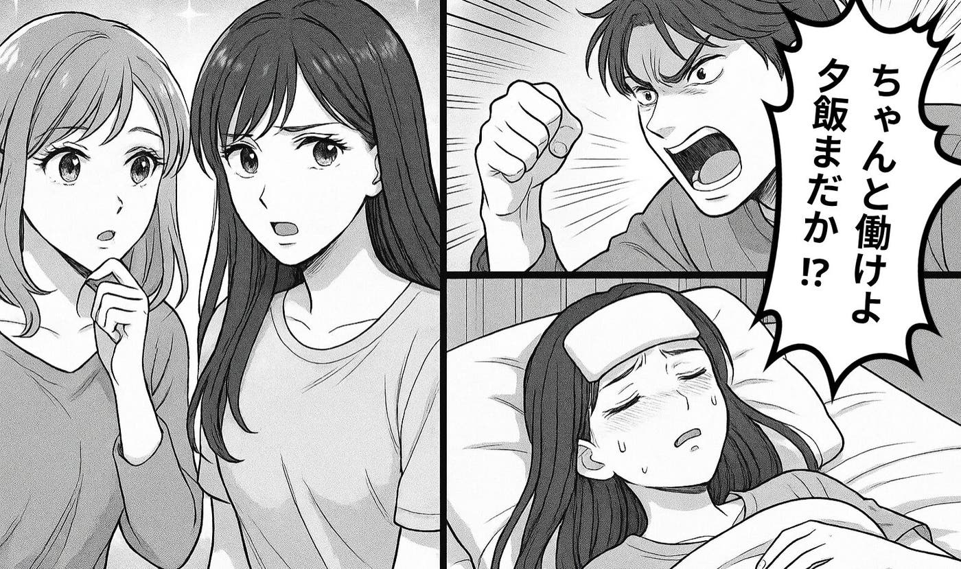 『夕飯まだか!?』40度で苦しむ妻に怒鳴る夫!しかし、友人に【夫のモラハラ】を相談すると…想定外の返答に唖然!?