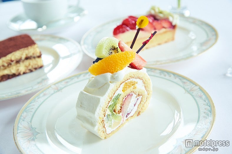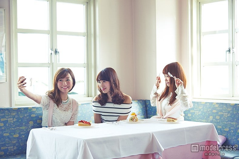 続いて訪れたのが、水色の洋館がなんともラブリーな老舗「レストラン ラ・マーレ・ド・茶屋」。フランスの邸宅のような洋館を2階へ上がると、内装もブルー・ホワイト・ピンクを基調としたフレンチガーリーな空間が。3人も「可愛すぎるー!素敵!!!」とテンションがあがるこちらで、ほっと一息カフェタイム。こんな素敵なカフェなら、女子会恒例のセルフィータイムも盛り上がりますね。