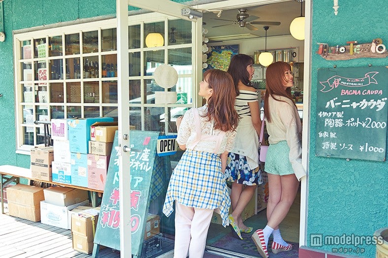 まったりカフェタイムで元気をチャージした後は、子授・安産にご利益があると言われ850年の歴史を持つ「森戸大明神(森戸神社)」へ。海辺が近いため風が心地よく、訪れるだけで心が洗われるような清々しい場所。眺めが良いことでも有名な神社なのだとか。さっそくお参りして真剣に願い事をした後は、恒例の恋おみくじタイム。「えー!待ち人遅くとも来る、だって!」(まいちゃん)「いいじゃん、見せてみせて!」(千春ちゃん)と、結果を読み合うのが楽しそう!鮮やかなグリーンの壁が目印の「TANTO TEMPO」は生ハム、チーズ、オリーブ、ワイン、パスタに調味料など、あらゆる本場イタリアの食材を集めたイタリア専門食材店。今日はここで、ドライブ女子会の最後を飾る特別なピクニックのフィンガーフードやドリンクをゲット!種類豊富な本場イタリアの食材に目移りしつつ、絶品のサラミやチーズ、ハーブバターを購入し、ピクニックの準備は万端です。