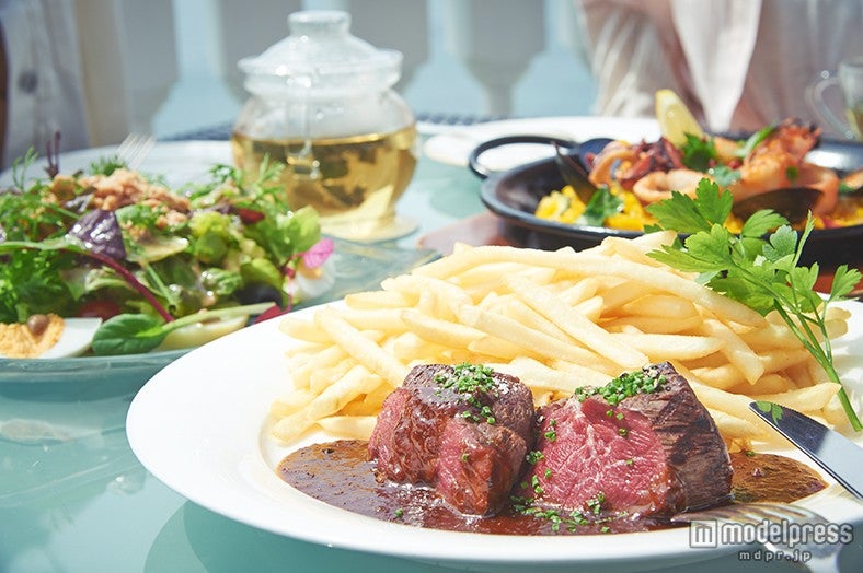 「こんなところ、デートで連れてきて欲しい!」(佐彩ちゃん&まいちゃん)「うん、ここは女子がみんな好きだと思う。間違いない!」(千春ちゃん)と、まるで海外いるような解放感あふれる空間に、3人とも終始目がハートです(笑)。今回はこちらで目の前に広がる相模湾の海の幸、三浦半島の陸の幸をふんだんに使用した地中海風パエリアと、短角牛フィレのグリルなどをランチに頂きました。