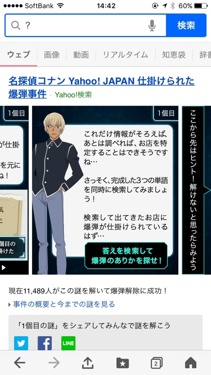 「Yahoo! JAPAN」アプリ内で、「コナン?」と検索すると「名探偵コナン Yahoo! JAPAN仕掛けられた爆弾事件」のページに飛ぶバナーを見つけることができます。