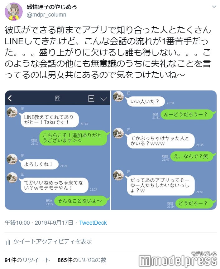 マッチングアプリ出会いで1番怖かったLINE発表 “生活把握男子”とは【2019年やじめろTwitter特集】モデルプレス -