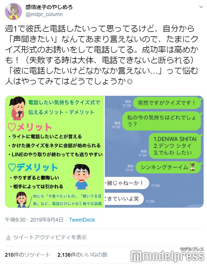 週1で彼氏と電話したいって思ってるけど、自分から「声聞きたい」なんてあまり言えないので、たまにクイズ形式のお誘いをして電話してる。成功率は高めかも!(失敗する時は大体、電話できないと断られる)「彼に電話したいけどなかなか言えない…」って悩む人はやってみてはどうでしょうか◎ pic.twitter.com/tepHZvIAcQ