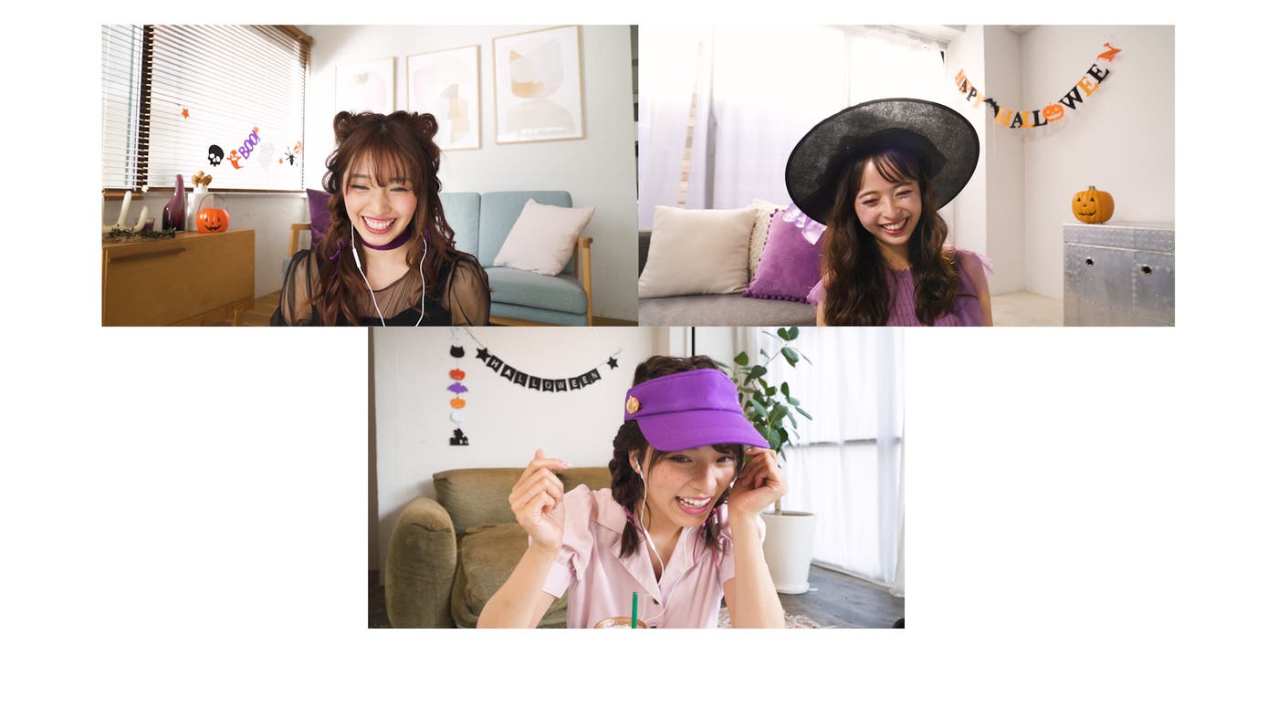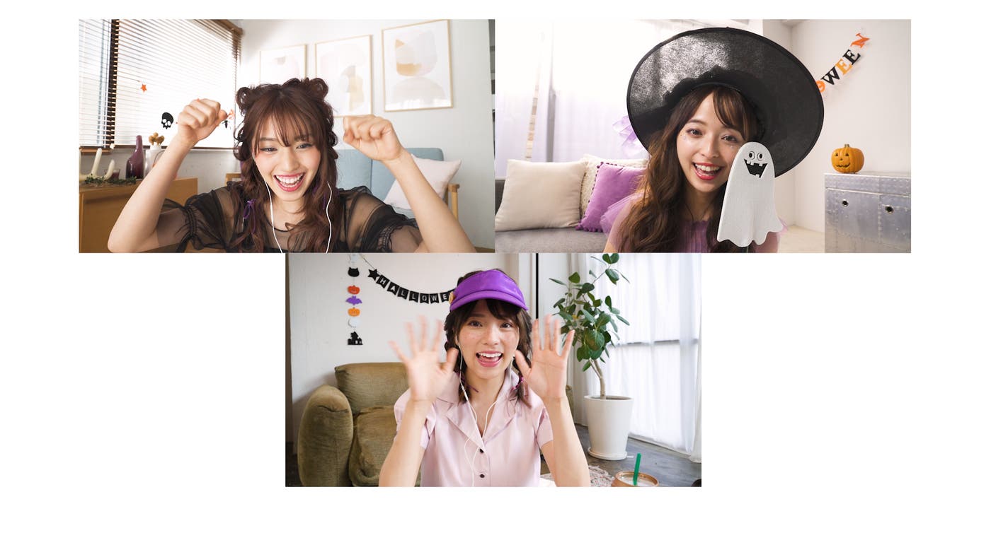3人はオンライン上で姿を見せ合うと、「可愛い~!」「似合う!」「私もやってみたい~!」と大盛り上がり。家にある服やコスメでも、ハロウィンの色味やモチーフを入れてアレンジするだけで、イメージががらりと変わりますね。