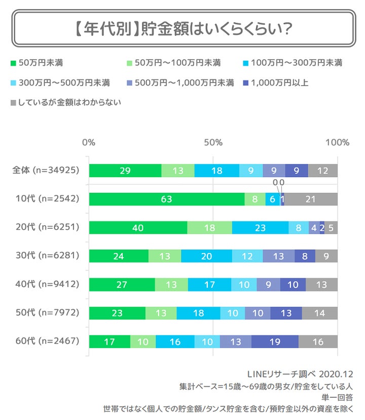 しかし、世の中には収入に関わらず貯蓄できている人がいることも事実。2020年12月に行われた世代別アンケート調査(※)によると、20代の80%、30代の75%が「貯金をしている」と回答。貯金額は「50万円未満」と回答した人が最も多く、次いで多かったのが「100万~300万円未満」となりました。