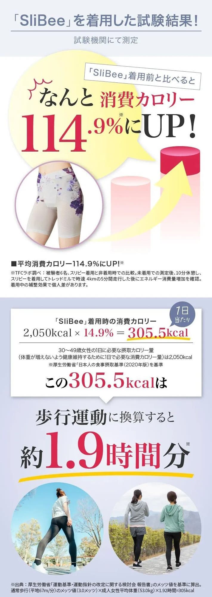 スリビーを着用して運動した時の消費カロリーは、1.9時間のウォーキングに相当します。