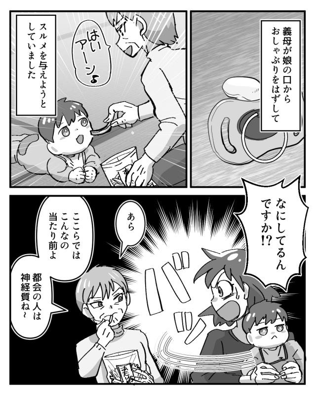 ある日、私が少し目を離したすきに、義母が娘のおしゃぶりを外し、何か食べさせようとしている姿が目に飛び込んできたのです。