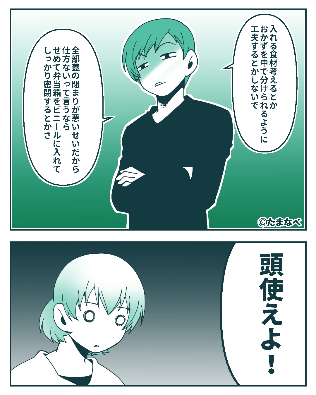 「おかずの詰め方を工夫するとか、ビニール袋に入れて密閉するとか、やり方はあるだろ!頭使えよ!」と私を罵倒したのです。