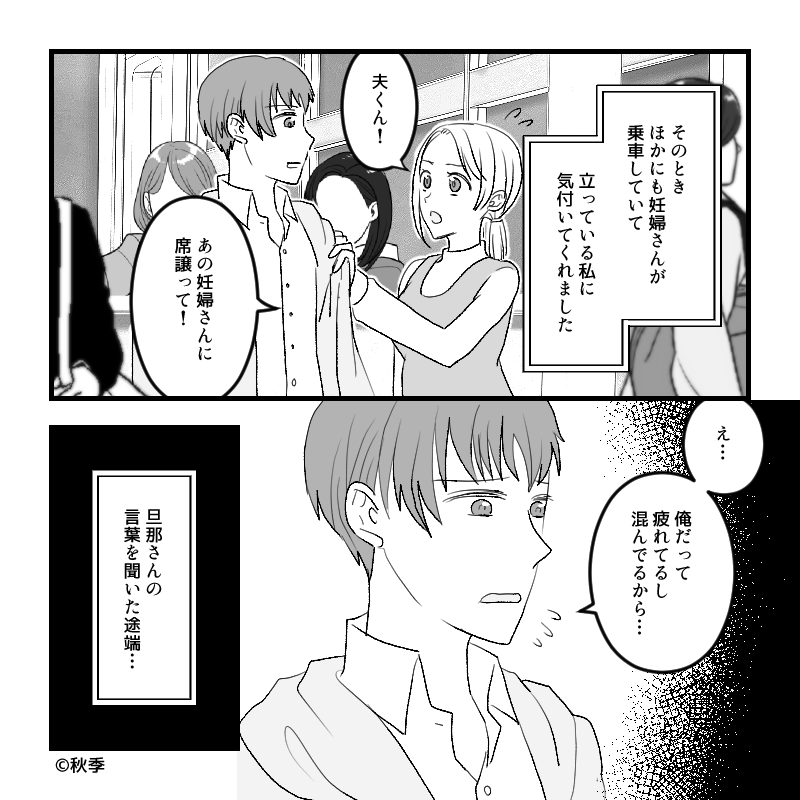 そこで私は「じゃあ替わって!」と強い口調で伝えると、夫はその妊婦さんに席を譲りました。