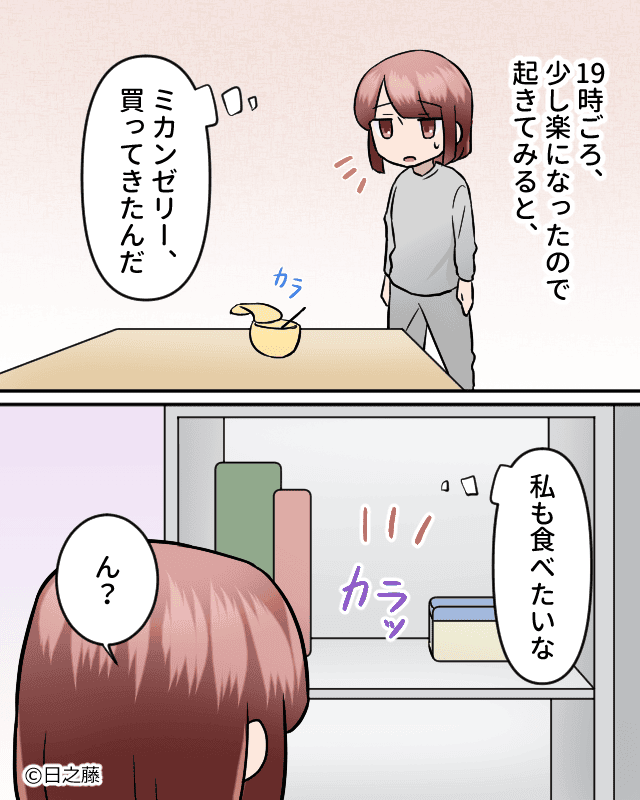 私の体調を気遣ってゼリーを買ってきてくれるなんて優しいな、と思った私は「ミカンがいい!」と伝え、そのまま寝込んでいました。