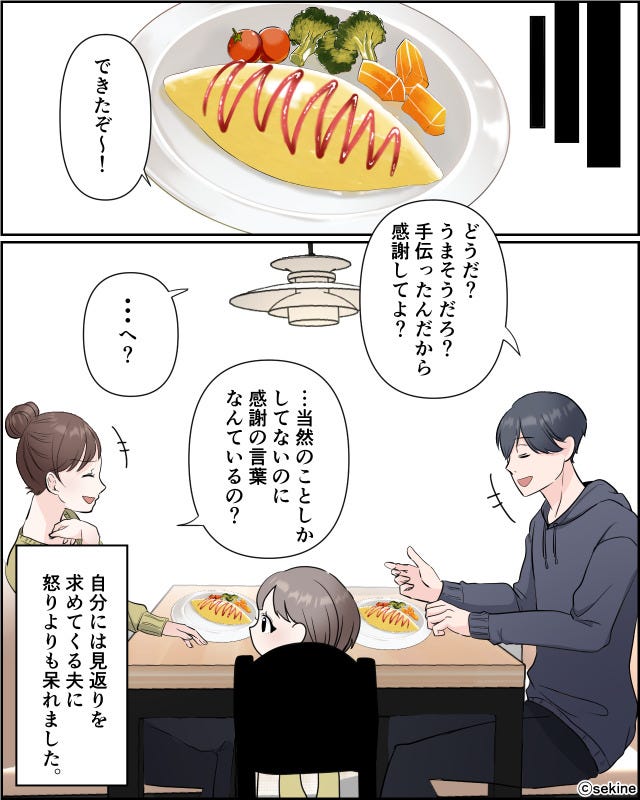 すると、たかだかオムライスを作るひと手間をお願いしただけで「手伝ったんだから感謝してよ?」と言ってきたんです。