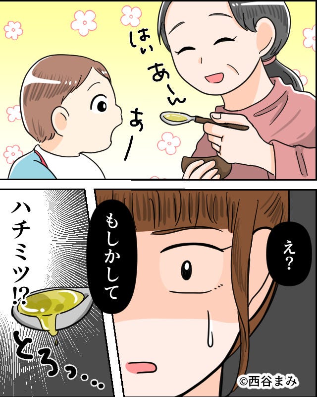 夫は大慌てで「ハチミツを乳幼児に食べさせるのは厳禁なんだよ!」と言い「まあ!そうなの!?」と驚く義母。
