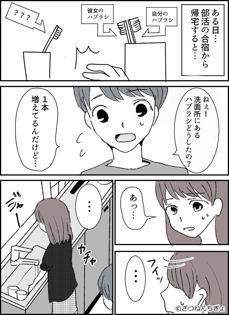 「ねぇ、この歯ブラシどうしたの?」と聞くと、彼女は「あっ…」と気まずそうに目をそらすだけで、その時は何も答えてくれませんでした。